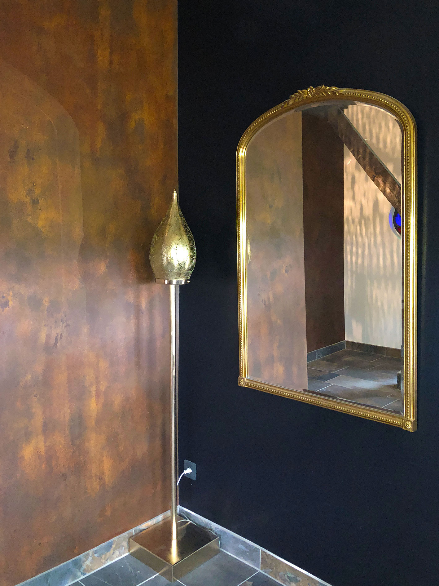 De wanden van deze mooie hal zijn bekleed met Novacolor Ironic, dit is een materiaal zit vol echt ijzer erts en bewerkt met speciale technieken.